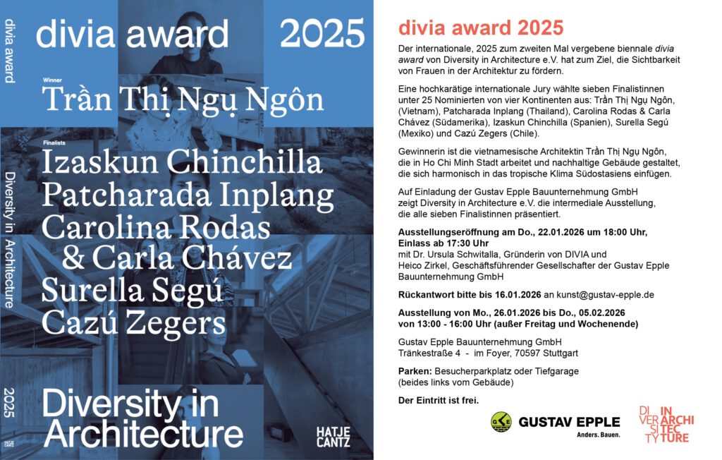 The visibility of women in architecture and the broader field of urban planning goes hand in hand with their public recognition. Awards like the DIVIA Award can significantly accelerate this development. Our platform and the DIVIA Award aim to recognize and honor the work of women architects, promote equity between male and female architects, and raise awareness of role models for young women in the field.